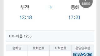 참여인증합니다 10월 24일 금 13시18분 부전역 출발 동해역 도착 ITX 마음 이용했습니다. 승차권 구입내역..
